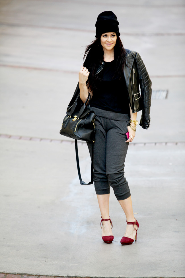 {Tank, Sweatpants (Similar), Beanie: H&M (Similar), Moto Jacket: Zara (Similar), Shoes: Forever 21 c/o The Beverly Center, Bag: 3.1 Phillip Lim, Watch: c/o Guess, Bangle: c/o Hearts, Cuff: c/o Jewelmint}
