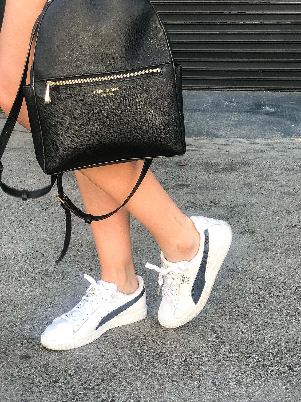 {The Deets: Tee – Vintage (Similar), Skirt H&M (Similar), Sneakers: Puma, Jacket: Esprit (Similar), Bag Henri Bendel, Sunnies: Quay Australia}