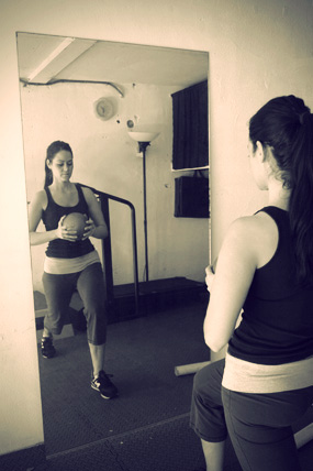 There are many variations to simple exercises. For example you can lunge while twisting a ball from side to side (see pic 2). This is working both legs and abs. You can also lunge to the side (pic 3), or to the back. You can squat with a overhead press (Below) to work both legs and shoulders.