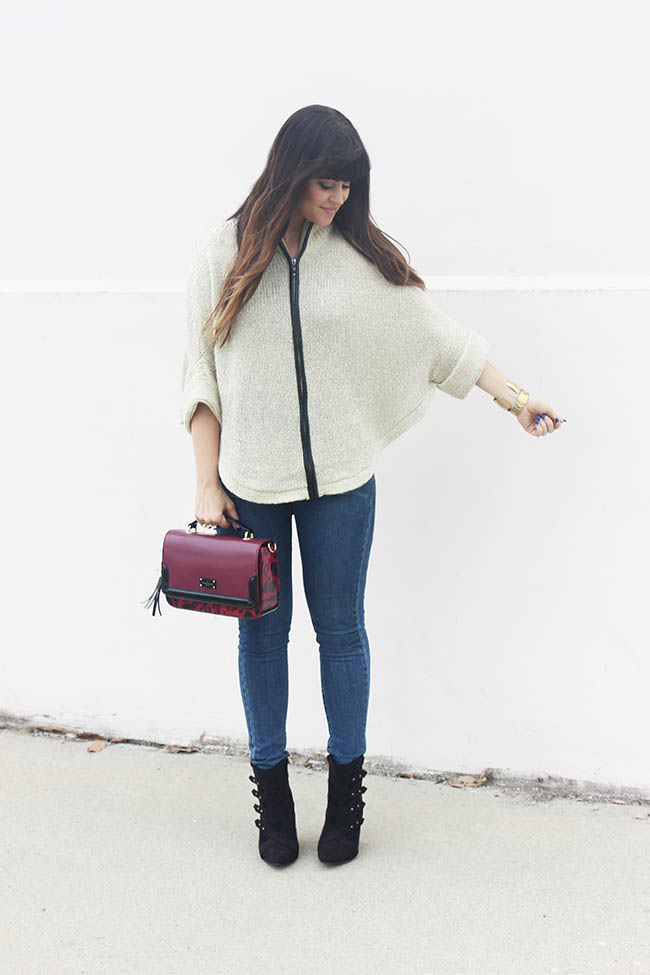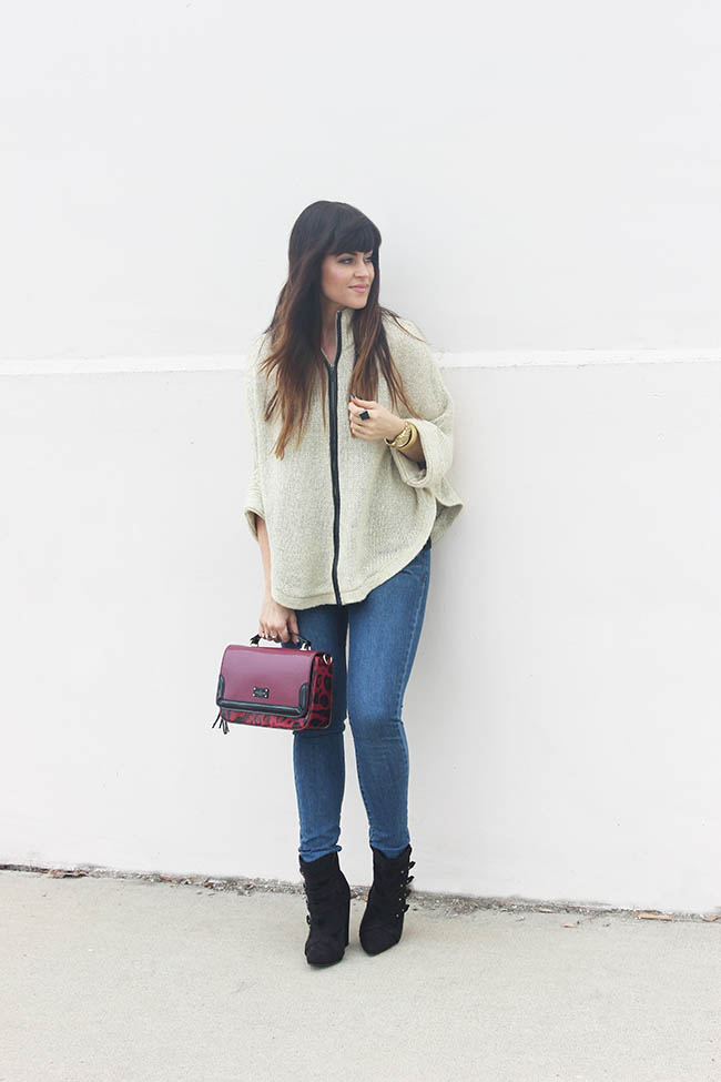 Enough about that, let’s talk about this outfit. As I said it was a little hazy the other day when these were taken and the fall feeling was in the air. It was the perfect opportunity to rock this cute poncho sweater from Tobi. A Poncho is such a cozy piece for fall and is a lot more fun than a regular sweater. I loved pairing it with my new favorite bag and fun wedge booties. It’s a simple outfit really, but the details are everything. Speaking of details, I mean can we talk about this raspberry leopard bag?? You may have seen me wear one similar here when I was in London. It’s a UK brand but their bag designs were made for me. Seriously obsessed!