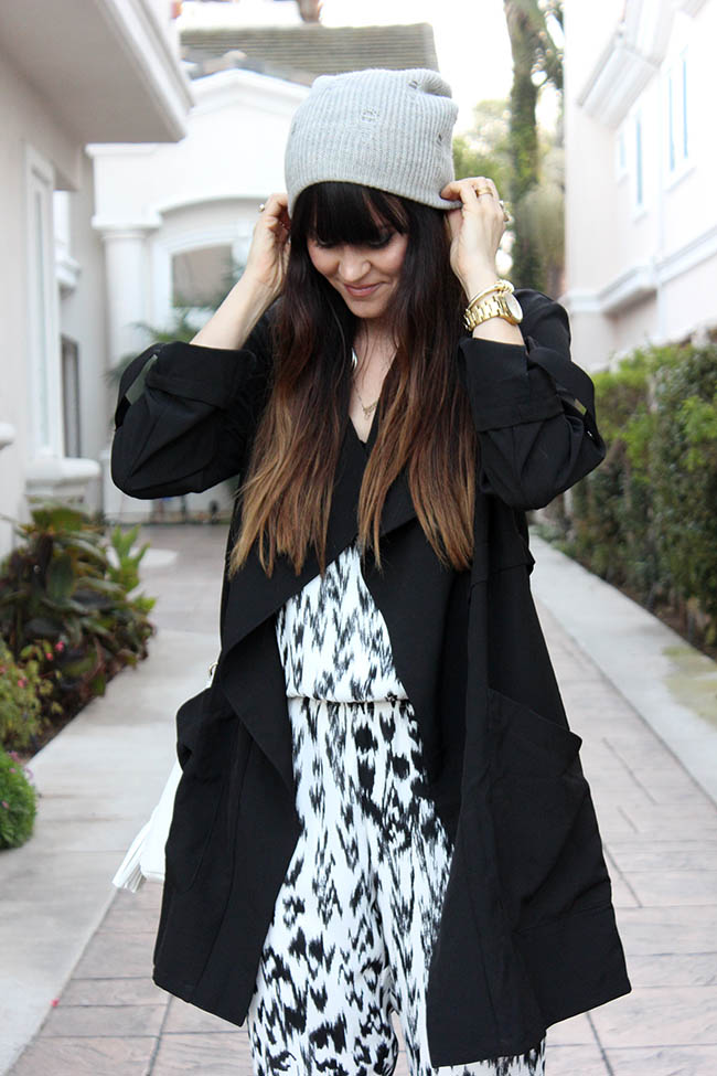 {Jumpsuit: Kardashian Kollection, (similar) Trench: Shop Tobi (similar), Booties: Rocket Dog, Bag: Just Fab, Beanie: AE Outfitters (similar),Ring & Bracelet: Sole Society, Watch: Guess}