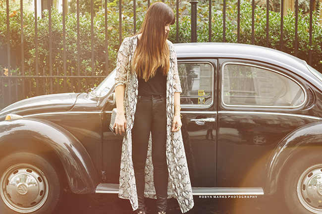 While in London I picked up quite a few python printed pieces and this kimono is definitely a new favorite, it just felt special, and as soon as I saw it, I knew it had to be mine. It’s a versatile piece because it’s actually a sheer button down maxi that can be worn a multitude of ways. Here I wear it as a kimono, but it can also be worn buttoned over a slip dress or a cami and pencil skirt. I personally like styling it with all black pieces so it can have it’s moment, but you can certainly do other things with it. I decided to pile it on with an equally as amazing python print bag. Normally I wouldn’t pair two animal print items, but there is something about this that just works.
