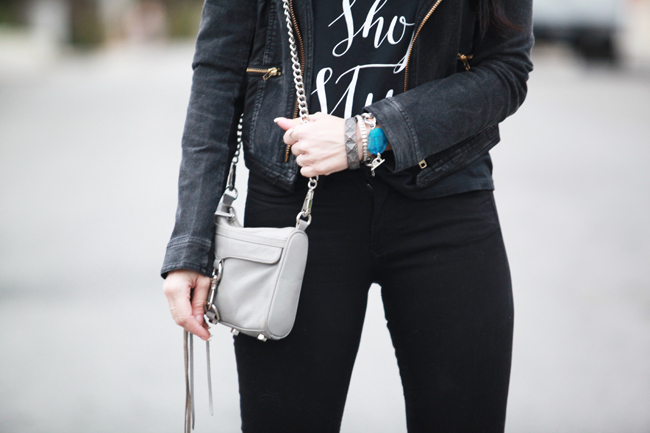 {Jacket: c/o Miss Me Jeans, Tee: c/o ShopStyle, Pants: H&M c/o The Beverly Center (Similar), Boots: Aldo (Similar), Bag: Rebecca Minkoff, Necklace: c/o Shoplately, bracelet: c/o Oia Jules}